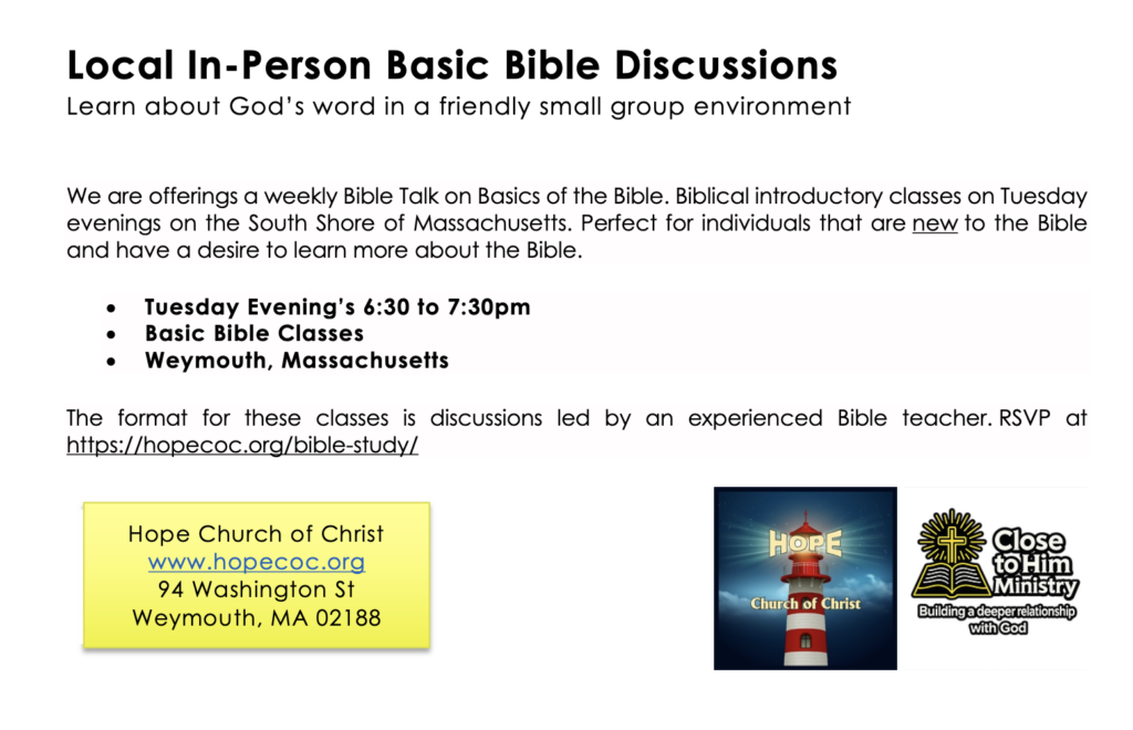 Adult Baptism (1) Baptism (2) Believe (2) Bible (5) Bible Challenge (1) Bible Class (2) Bible Lessons (1) Bible Study (1) Bible Talk (1) Born Again (4) Called (1) Changed (1) Church (3) Church Gatherings (1) Classes (1) Covenant (1) Creation (1) Faith (3) Freedom (2) Gatherings (1) Genesis (1) God's Word (7) Holy Spirit (2) Jesus Christ (8) Jesus the Christ (1) Liberty (1) Massachusetts (1) Mission Trip (1) New Covenant (1) New Life (1) New Testament (1) New Wine (1) Obey God (4) Poverty (1) Redeemed (1) Redemption (1) Salvation (2) Saving Faith (1) Storms (1) Suffering (1) Wineskins (1) Word (1) World Bible School (1) Worship (1) Youth (1)