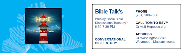 We are offerings a weekly Bible Talk on Basics of the Bible. Biblical introductory classes on Tuesday evenings on the South Shore of Massachusetts. Perfect for individuals that are new to the Bible and have a desire to learn more about the Bible.